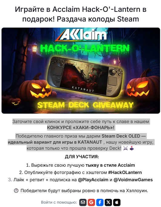 А в преддверии Хэллоуина Acclaim даёт поклонникам последний шанс принять участие в розыгрыше Katanaut «Hack-O'-Lantern». Раздача, организованная Gleam, подарит одному счастливчику 512 ГБ OLED-накопителя Steam. Вырезать тыкву в стиле Acclaim будет полезно, но не обязательно. Затачивайте свои катаны (или ножи для резьбы), ведь приём заявок заканчивается в полночь по восточному времени 31 октября .