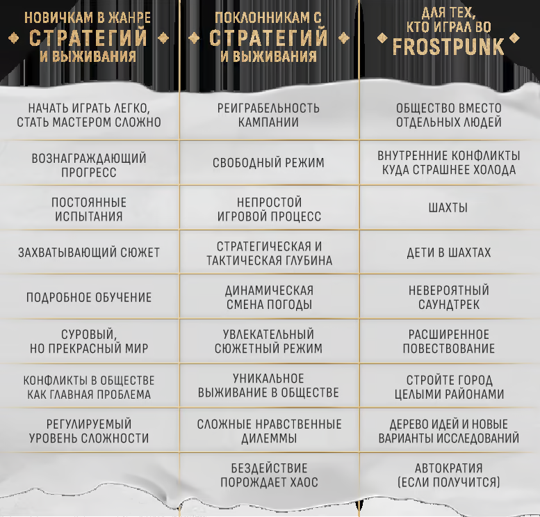 Каждая фракция теперь представляет собственную уникальную утопию, структурированную в древо развития. По мере завоевания доверия игроки открывают специализированные законы, здания и способности, укрепляющие идентичность фракции. Разблокировка всех узлов древа утопии позволяет воплотить единое видение города, связав общество одним путем развития и навсегда разрешив напряженность.