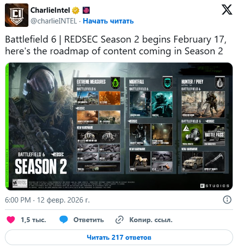 В последнем посте на X (ранее Twitter) от CharlieIntel представлена дорожная карта и даты второго сезона Battlefield 6 REDSEC. Контент распределен по трем месяцам: февралю, марту и апрелю; он включает в себя 2 новые карты, несколько временных режимов, возвращающиеся и новые транспортные средства, новое оружие и многое другое. Полную дорожную карту второго сезона Battlefield 6 REDSEC смотрите ниже: