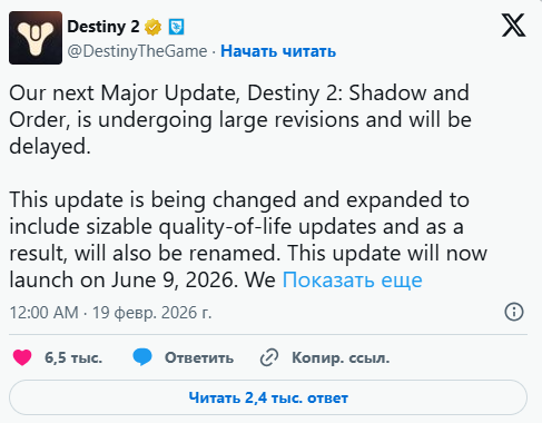 Выход следующего крупного обновления для Destiny 2 официально отложен до 9 июня 2026 года.
