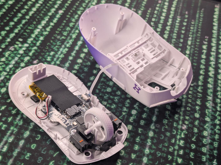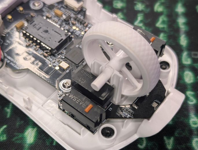 Разборка мыши происходит типичным методом, надо отклеить глайды и открутить четыре винтика. Внутри наблюдаем типичную для современных ультралегких мышей картину с максимальной оптимизацией конструкции под уменьшение веса. Интересно видеть это в бюджетном сегменте. Колесико прокрутки простое: без подсветки, без freewheeling, без горизонтального скроллинга. Шаг четкий, без провалов.