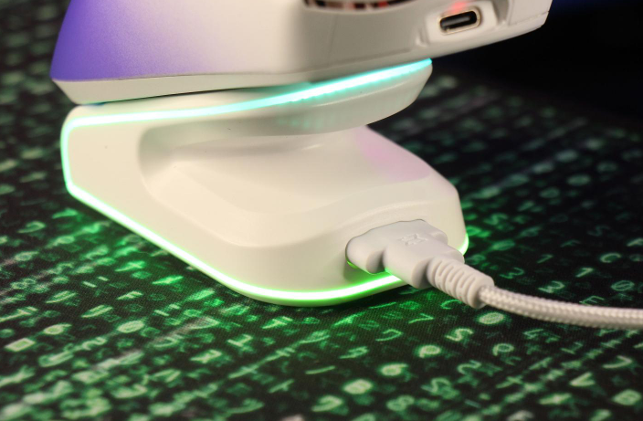 Станция выполняет сразу три функции. Во-первых, она организовывает зарядку: мышь достаточно просто поставить сверху, когда не используется, вместо того, чтобы каждый раз подключать кабель. Во-вторых, донгл фиксировано находится на станции, ближе к мыши, что улучшает качество сигнала 2,4 ГГц. В‑третьих, станция имеет собственную RGB-подсветку с регулировкой кнопкой снизу: удержание в течение 3 секунд включает или выключает свет, короткое нажатие переключает эффекты.