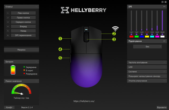 Hellyberry HM47 Pro Wireless работает с собственным приложением, которое загружается на hellyberry.eu. Интерфейс одностраничный в фирменной черной гамме с зелеными акцентами, версия на время теста — 2.1.4. Все настройки сохраняются во встроенной памяти мыши на три профиля и переходят с устройством на другой ПК без необходимости устанавливать ПО повторно.